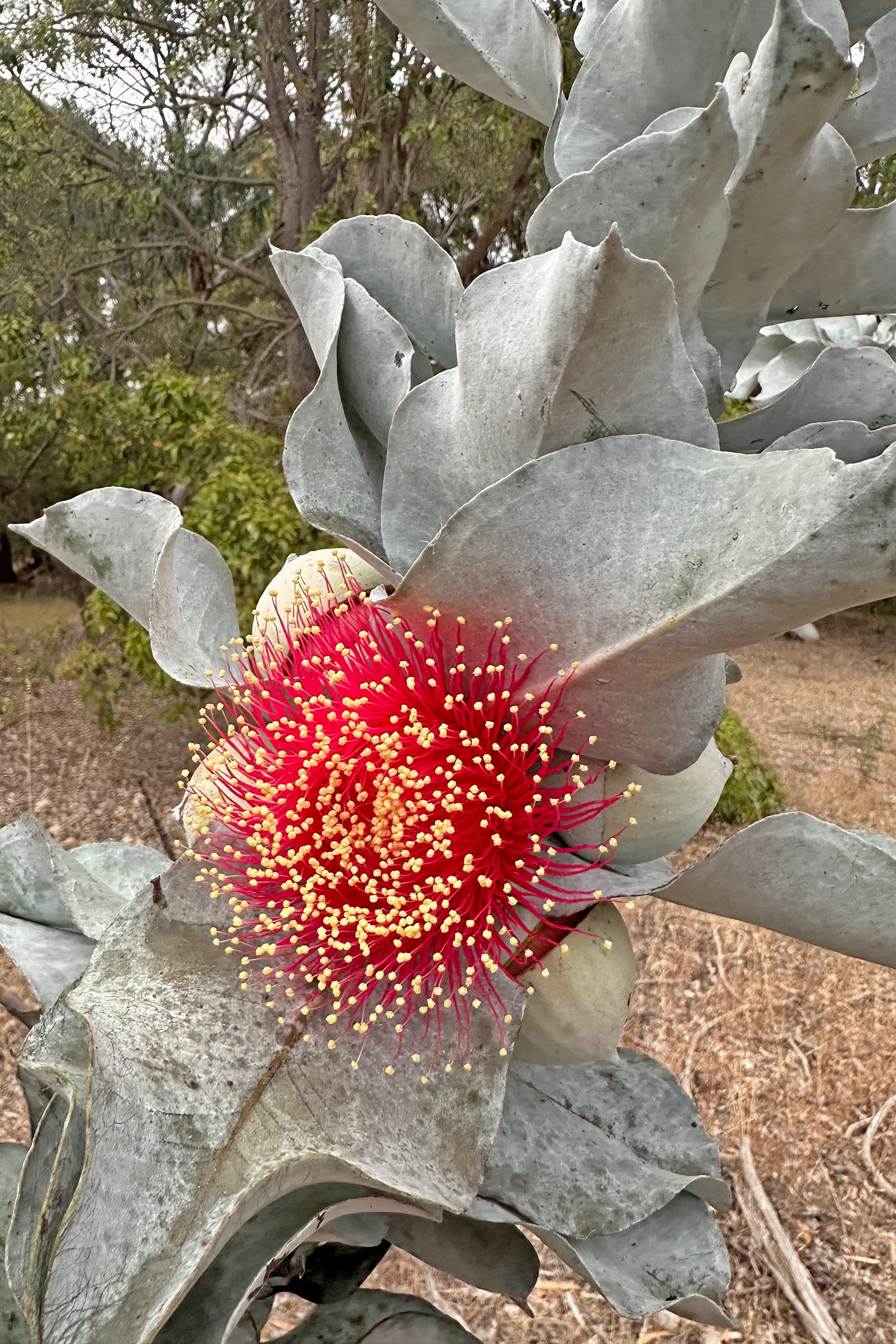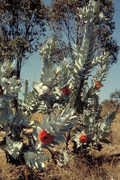 It can flower throughout the year but mostly from June to October. The fruit and flowers can be up to 10cm with the flowers usually bright red but pink-red forms have been observed. Flowering occurs from early spring to mid summer. The fruit or nuts have a powdery grey covering.